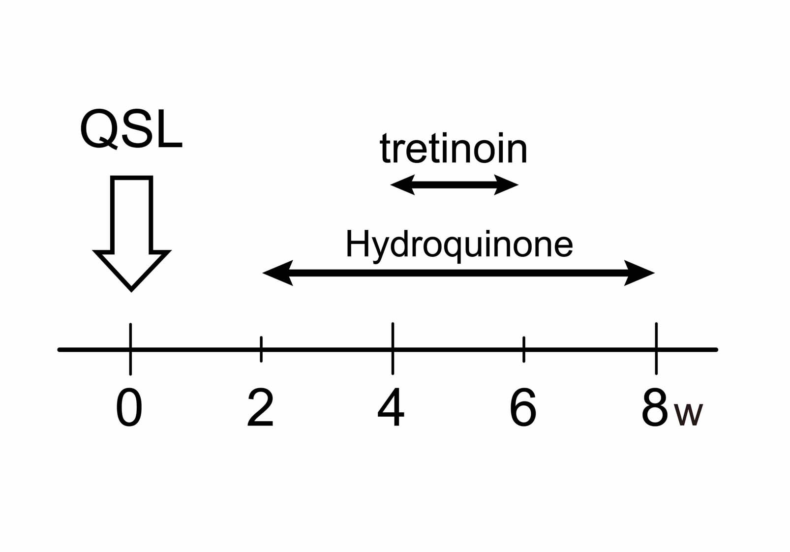 Qスイッチルビーレーザーを照射した。2週間後よりハイドロキノン軟膏を外用したのち4週間後からレチノイン酸治療を行った。